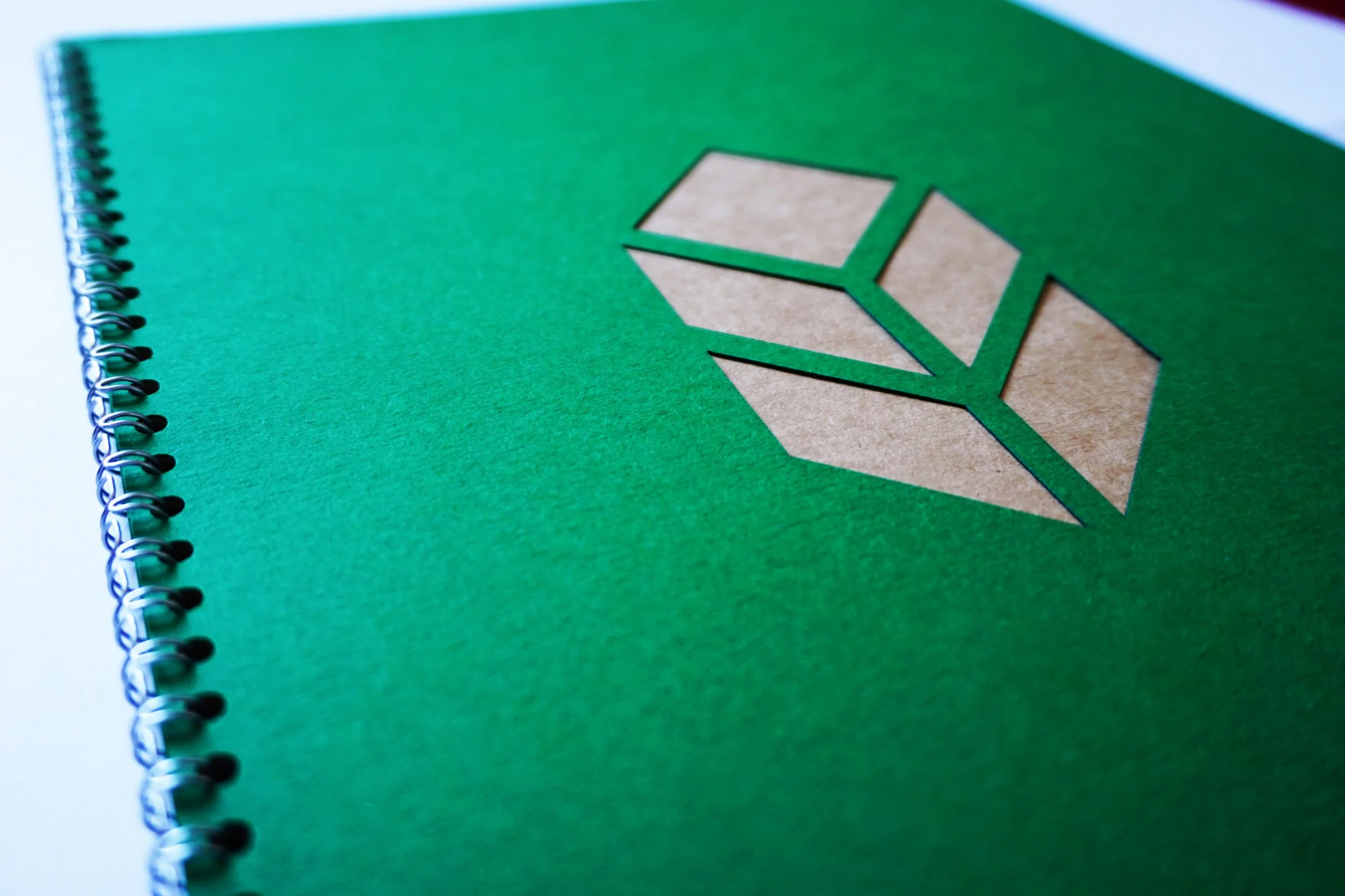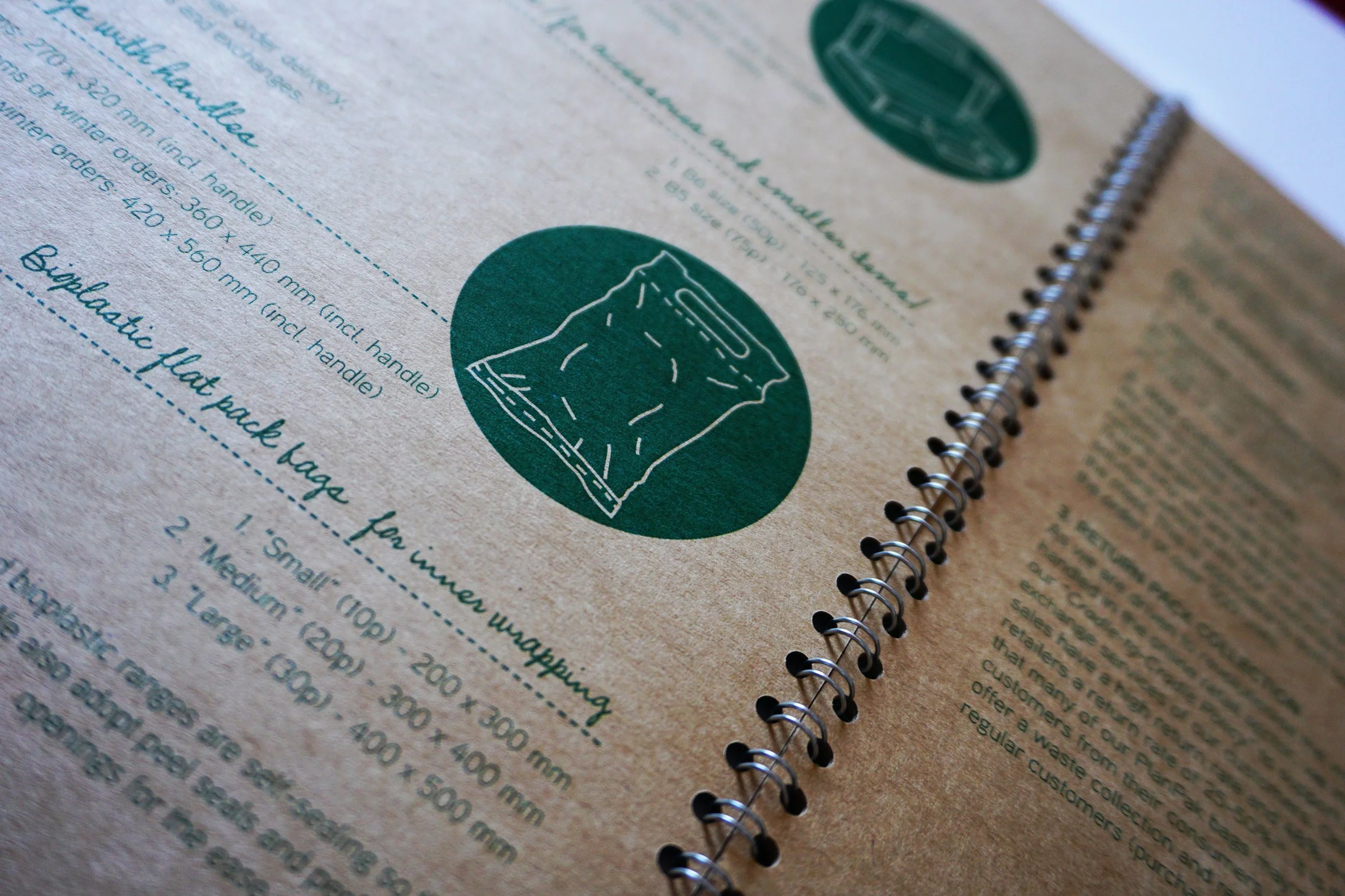 I printed our research on recycled kraft paper with green inks to emphasise our eco-friendliness, and the logo was laser-cut out of green cardboard for the cover.