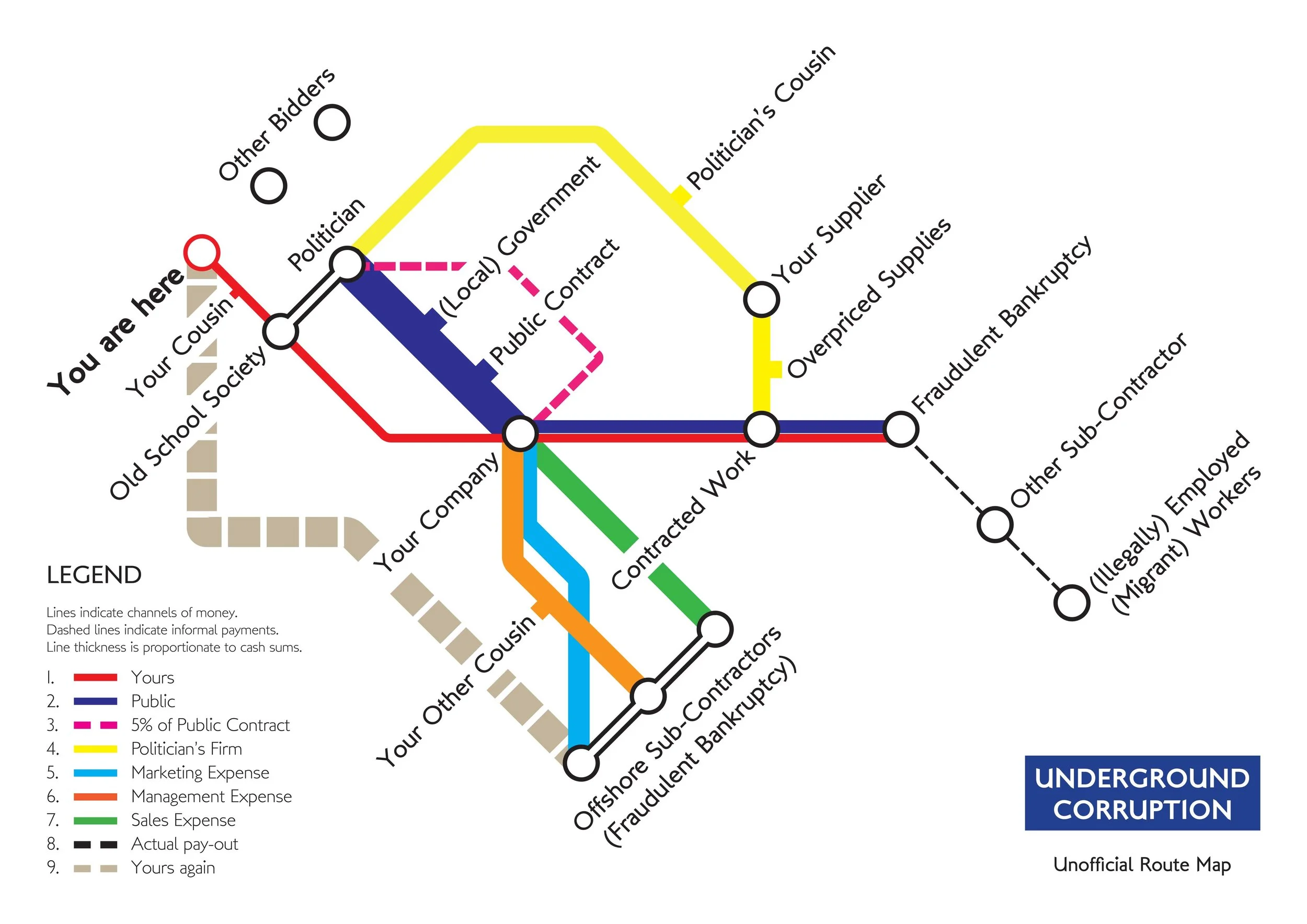 My work is showing a general pattern of corruption in bidding for a public contract, and my purpose was to show how - while its participants gain - damage is caused to fair competition. I have used the London Underground map as a visual reference, not only because it is a classic example of great infographic design, but also it works as a symbol that corruption often goes undetected and it is mostly happening under the surface.
