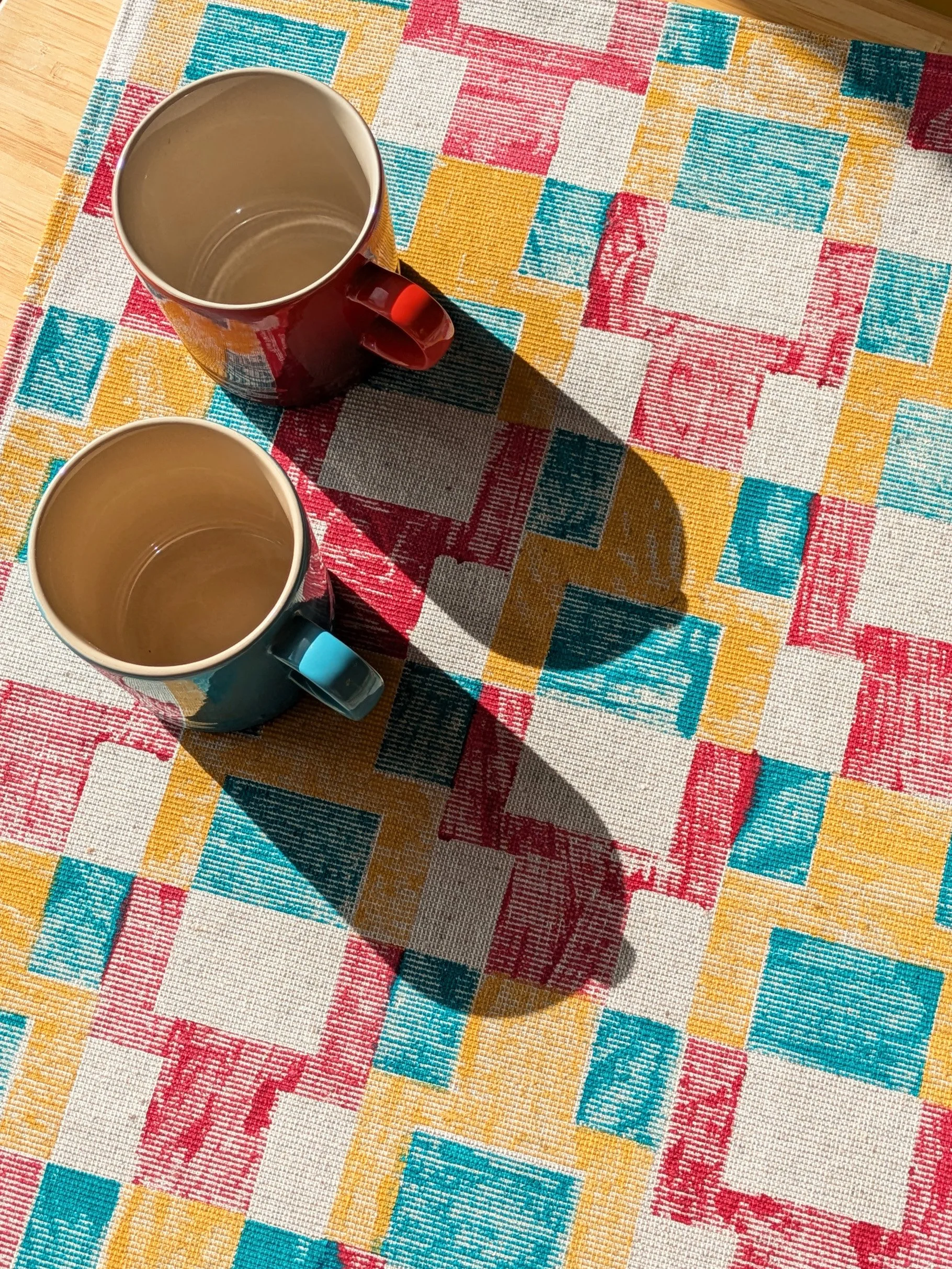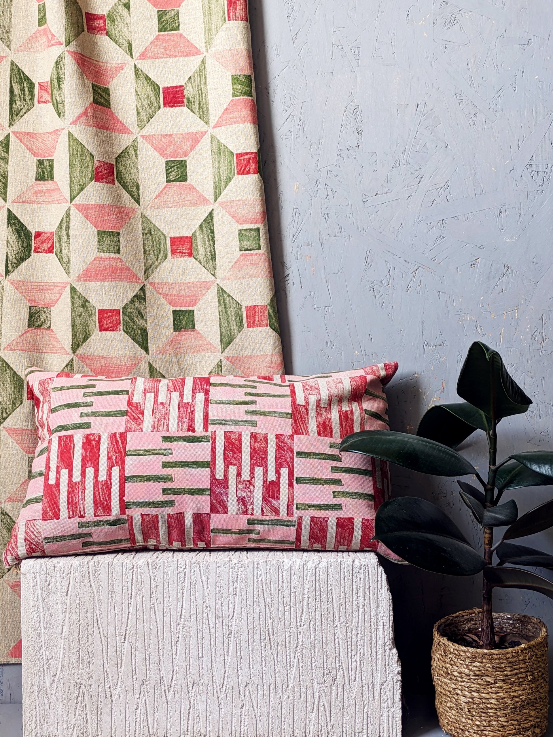 Each textile is hand-printed using a standardised tileset. This 'modular geometry' ensures full customisability while maintaining architectural precision—no two outcomes are identical, yet all remain within a cohesive aesthetic grid.