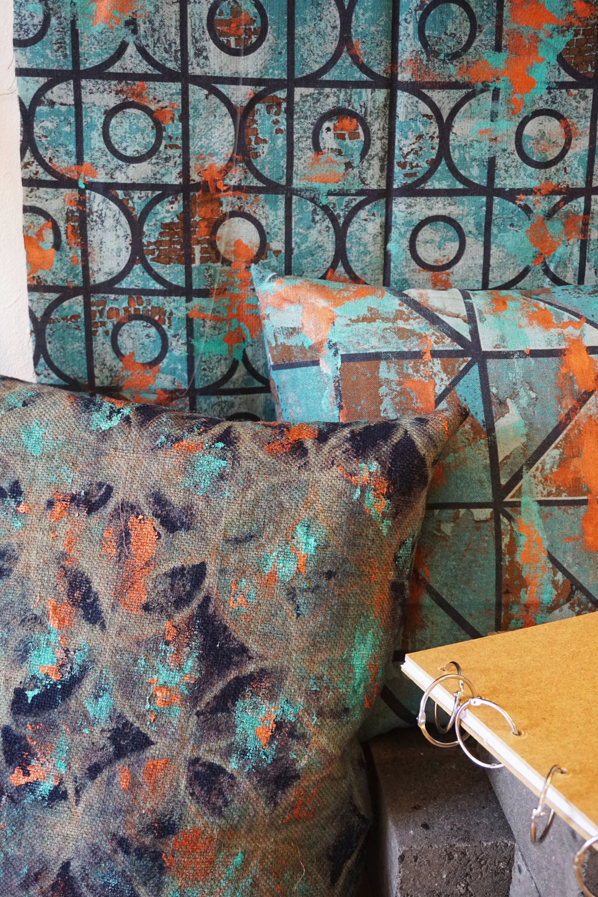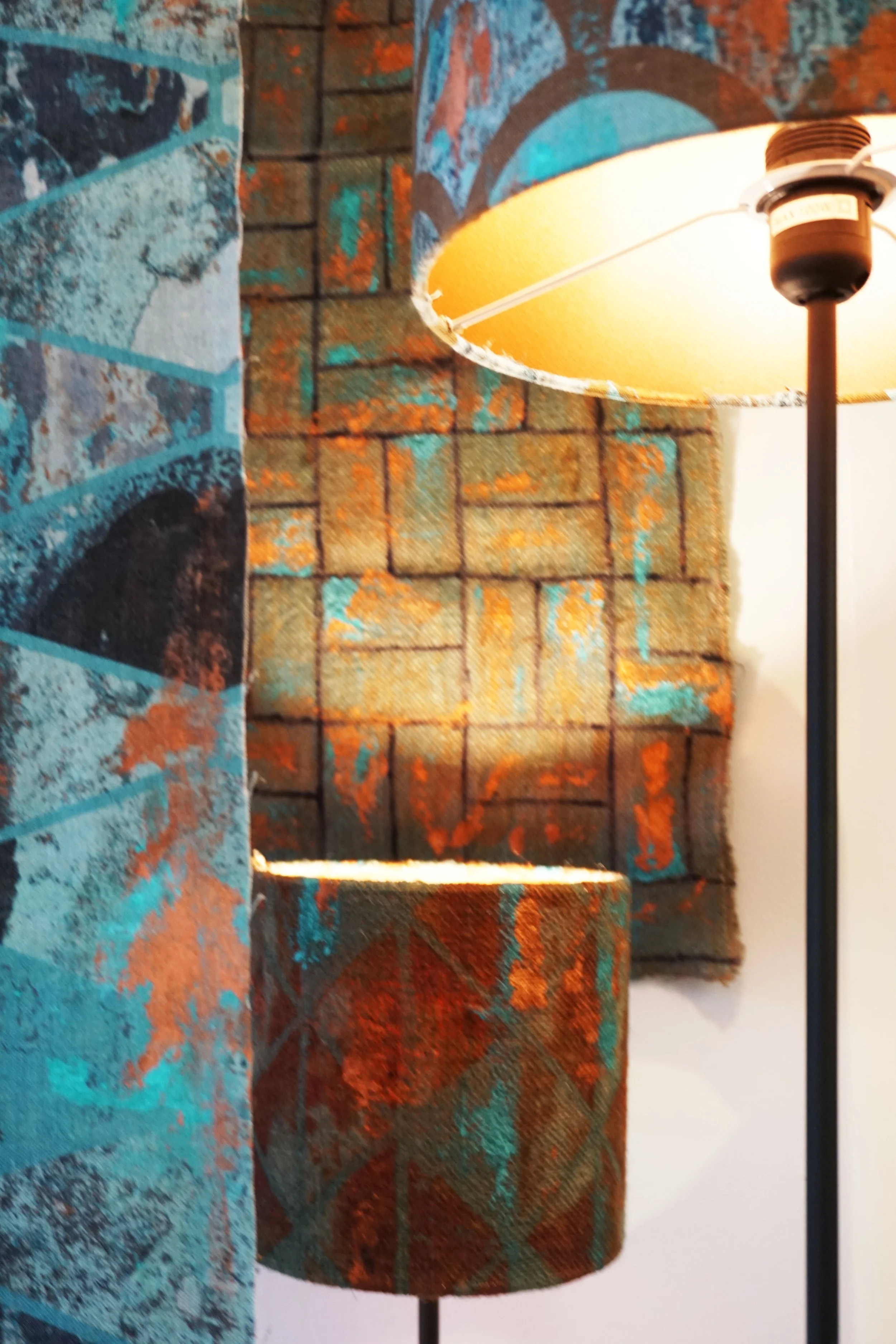Digital printing preserved the photographic details, but a metallic finish was introduced to the prints too, with copper colour. It matches the industrial theme of the collection and the colour scheme too: copper oxidises in green/blue shades which further emphasises the corroding effects. Applying it with a brush created a completely randomised, organic effect. The metallic finish also contrasts the coarse base fabrics well.
